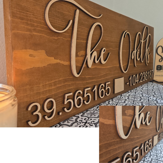 Custom Family Name Sign with Coordinates – 9x24 Wood Plank | Personalized Home Decor