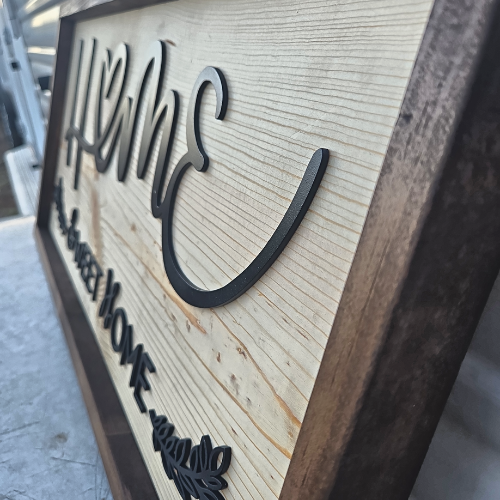 This sign features a natural pine backer, framed in solid wood, with raised 3D lettering for a layered, dimensional look. The flowing script “Home” paired with classic “Sweet Home” detailing creates a timeless focal point for entryways, living rooms, kitchens, or above a mantel.