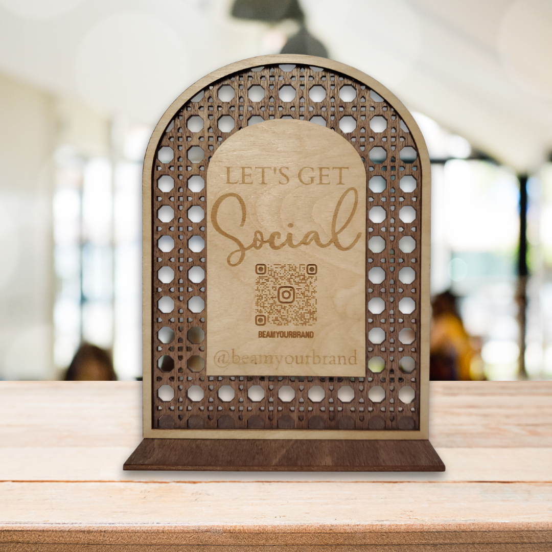 These rattan look wood social media signs are perfect for your store countertop or your checkout stand at market events. Add one social media or website QR code.
