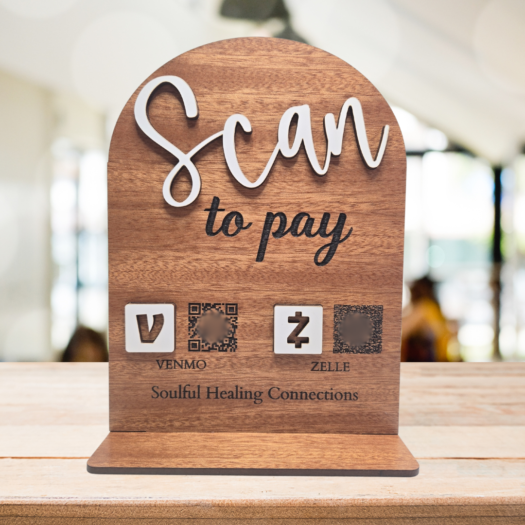 These wood social media signs are perfect for your store countertop or your checkout stand at market events. Add 2 QR codes for the payment sites of your choosing. Signs can be customized with a small logo, website, or company name at the bottom.