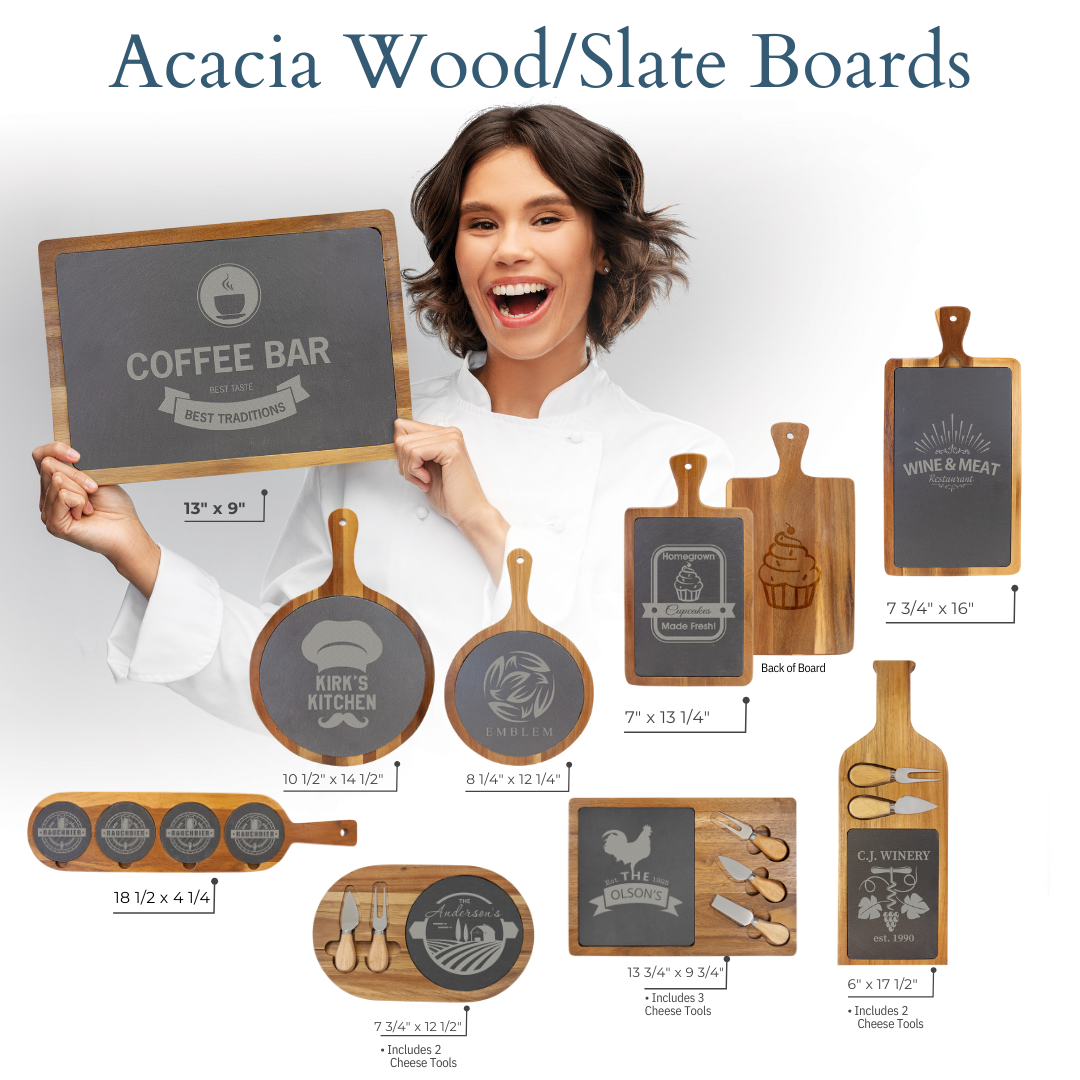 These custom engraved solid wood boards with personalized to make the perfect gift. Ideal for weddings, housewarming, client closings, and employee appreciation! They are also beautiful, useful pieces to add to your own kitchen, and use to host your favorite guests. The cutting boards are made of slate and solid Acacia wood. Slate pieces are durable and easy to clean. These pieces are not recommended for use as cutting boards.